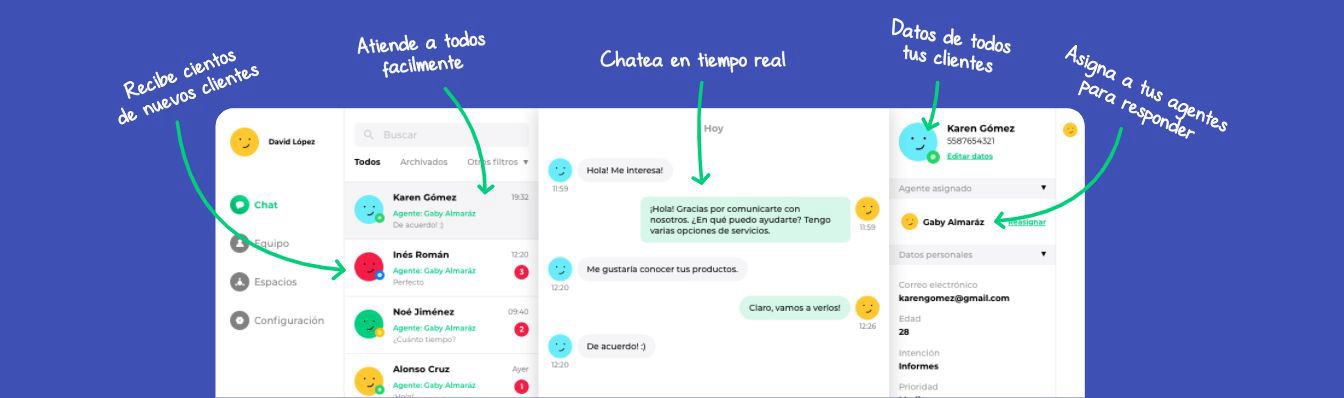 Cada miembro de su equipo tendrá acceso a un potente panel que les permitirá recibir conversaciones en tiempo real para interactuar de forma inmediata con sus clientes. El panel permite: etiquetar, agregar notas y reasignar conversaciones de WhatsApp, WhatsApp Business y Facebook Messenger ¡en un solo lugar!